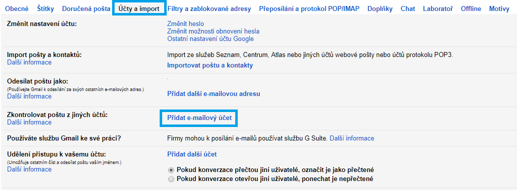 Nastavení pro Gmail.com Nastavení přijímání pošty z firemní adresy na účet v Gmailu provedeme přes Nastavení > Účty a import > odrolovat dolů na položku Zkontrolovat poštu z jiných účtů.