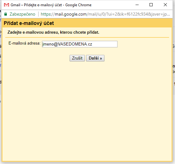 1. Stisknutím tlačítka Přidat emailový účet se otevře vyskakovací okno (je tedy nezbytné mít povolená vyskakovací okna) kam vyplníme e-mailovou schránku, tedy jmeno@vasedomena.cz